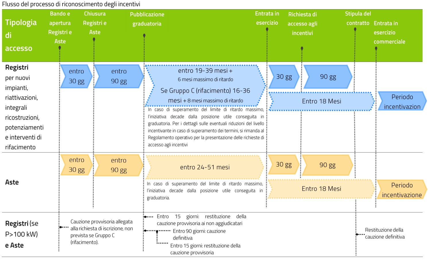 Gli impianti risultati ammessi in posizione utile ai Registri o alle Aste potranno presentare domanda di accesso agli incentivi entro 30 giorni dal termine massimo per l’entrata in esercizio previsto dal D.M. 04/07/2019 per le differenti fonti (da 16 a 51 mesi dalla data di pubblicazione della relativa graduatoria, più un eventuale ritardo massimo di 6 o 8 mesi). Il superamento del termine di 30 giorni per presentare la domanda di accesso agli incentivi (c.d. “fuori tempo”) comporta uno slittamento della data di entrata in esercizio, la riduzione del periodo di diritto all’incentivo, l’eventuale riduzione della tariffa o la decadenza dal diritto agli incentivi.