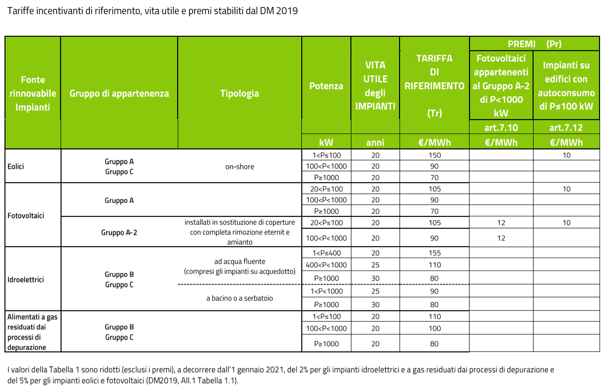 In caso di ammissione in posizione utile nella graduatoria del Registro o dell’Asta di riferimento, a seguito dell’entrata in esercizio, ciascun Soggetto Responsabile presenta invece autonoma istanza di accesso agli incentivi per il singolo impianto. La tariffa di riferimento da applicare per la determinazione della tariffa spettante è individuata sulla base tabella 1.1. dell’Allegato 1 al D.M. 04/07/2019, in funzione dalla potenza complessiva dell’aggregato.